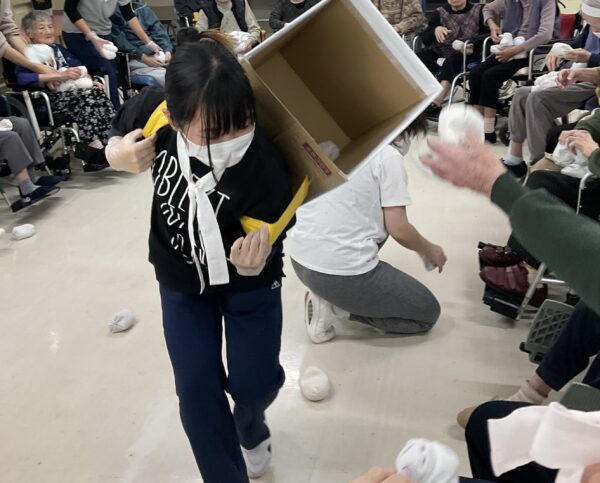 第二種目は玉入れ!職員の背負った籠めがけて、皆さん玉を投げられました!