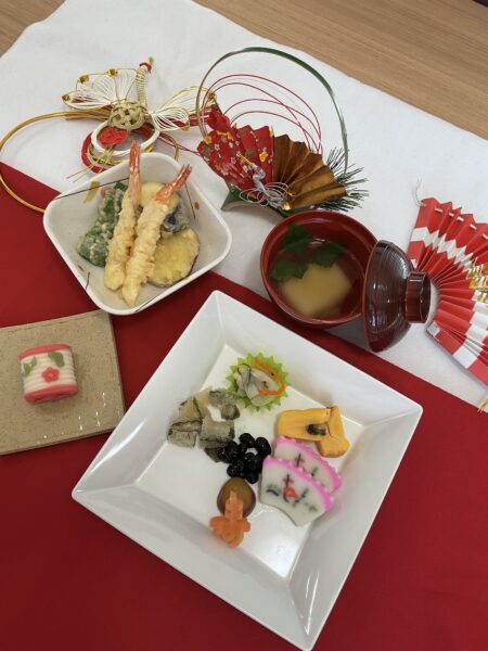 元旦におせちと天ぷらの盛り合わせを提供しました。