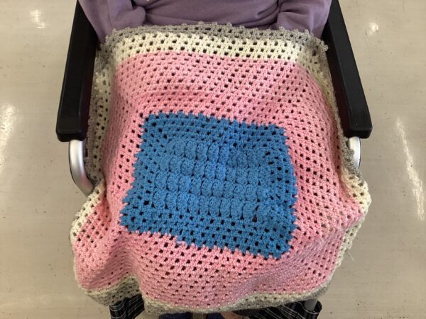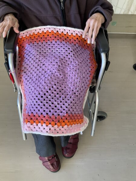 ご利用者様の編んだひざ掛けを他の利用者様にお掛けすると、「まごころがこもっているね」「あったかいです」と心もポカポカするような関わりも見られていました。