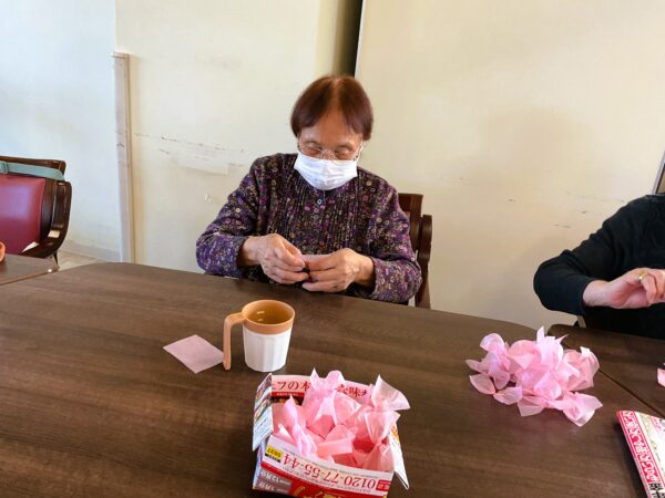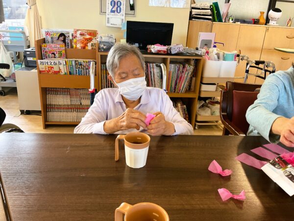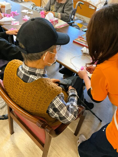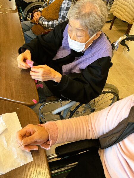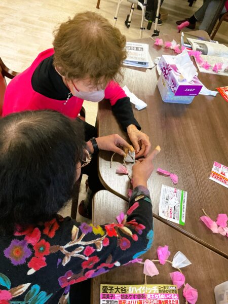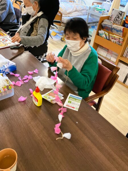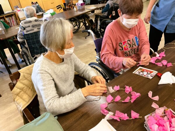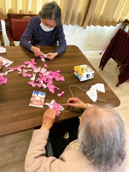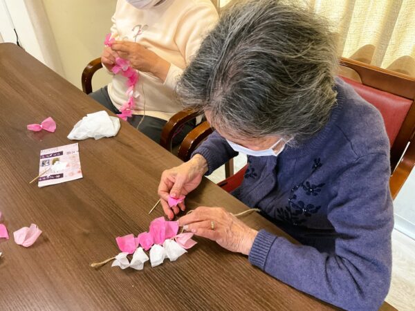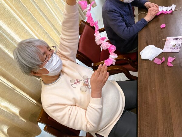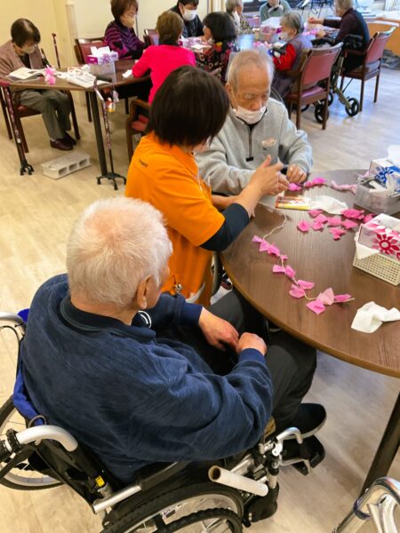 デイケアでも、春の装い準備に取りかかっています。利用者様のご協力で、枝垂れ桜をメディコにも咲かせようと準備しています🌸