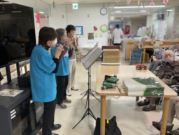 3階では先日、ボランティア活動で約半年ぶりに『オカリナ・エコー様』が来設されました!演奏会では昔懐かしの楽曲で“高校三年生”、“おぼろ月夜”、季節を感じられる“さくら”などをオカリナで吹かれ、素晴らしい演奏でした!皆さんもタンバリンや手拍子などをされ、とても喜ばれておりました☺今では珍しくなってしまった、紙芝居も行ってくださいました🎵