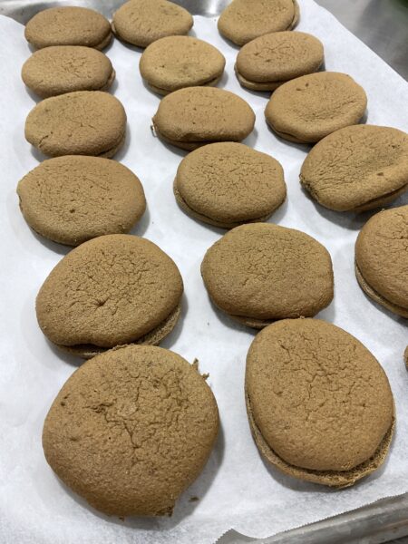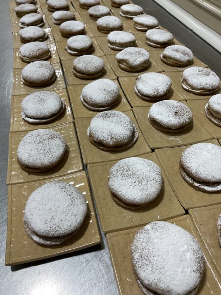 ほうじ茶クリームをサンドし仕上げに粉糖をかけて提供しました。