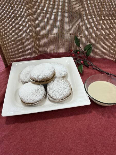 ほうじ茶クリームをサンドし仕上げに粉糖をかけて提供しました。