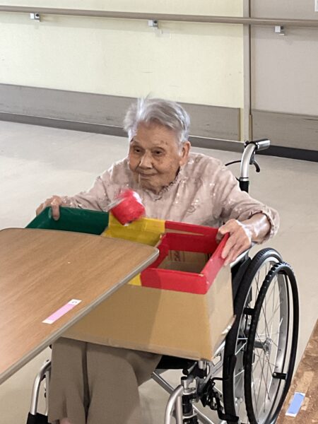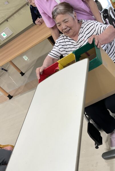 ゆっくり規則的に球が転がってくることもあれば矢継ぎ早に繰り出されることもあり、箱になんとかボールを収めようと利用者様はあっちこっち大立ち回りのてんてこ舞い。うまく箱に入れられて笑顔になる人もいれば、うまくいかず悔しい思いをした方も……!結果としては大盛り上がりの大盛況、みなさま楽しまれました。大成功に終わりよかったです。